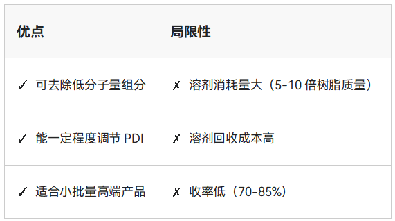 【工艺流程】 树脂溶于有机溶剂 → 加入不良溶剂沉淀 → 过滤 → 真空干燥
