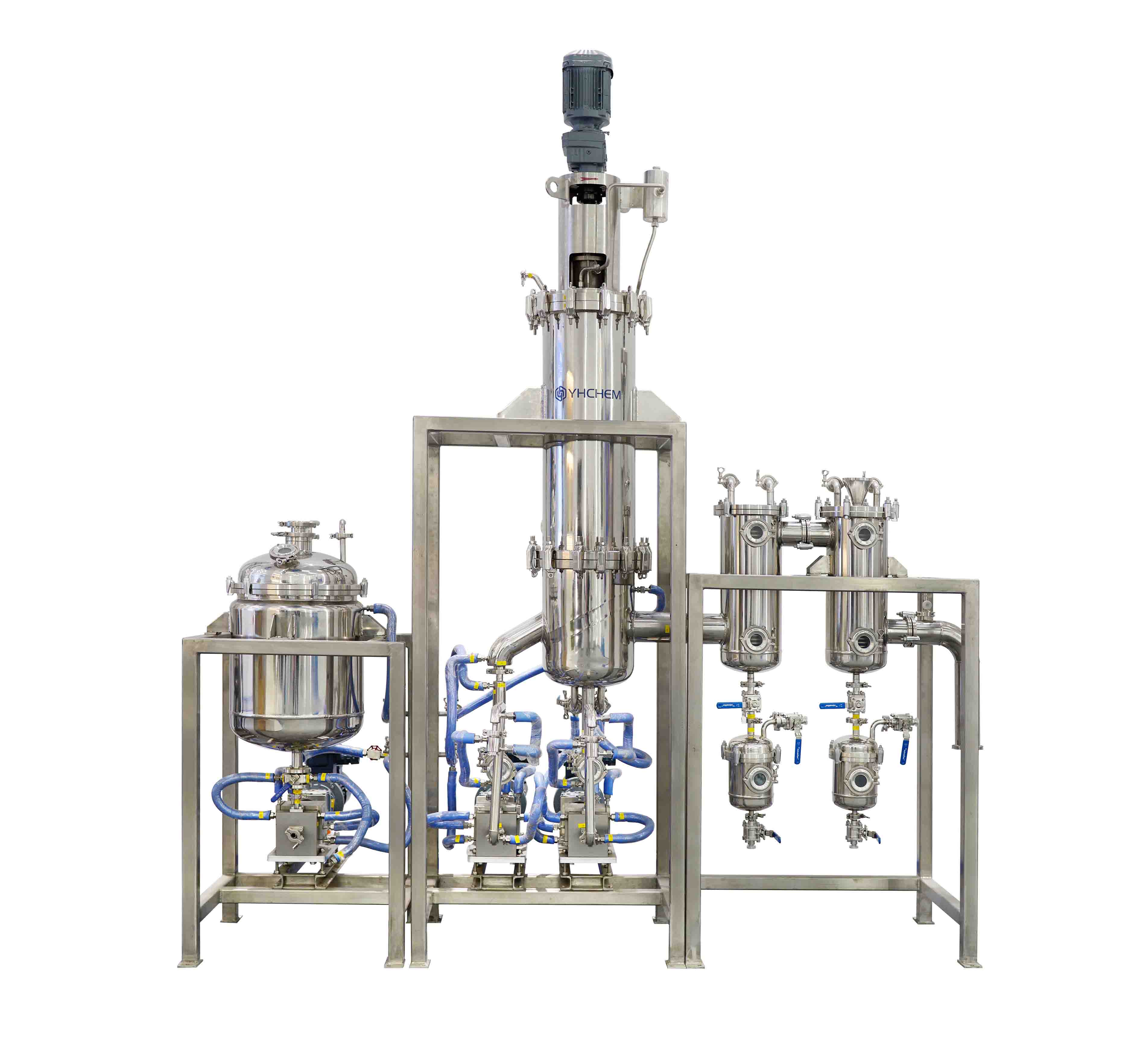 薄膜蒸馏系统通过刮板成膜技术让物料在主蒸发器内壁形成薄膜,传热传质效率极高,分离速度快,适配工业化连续生产。