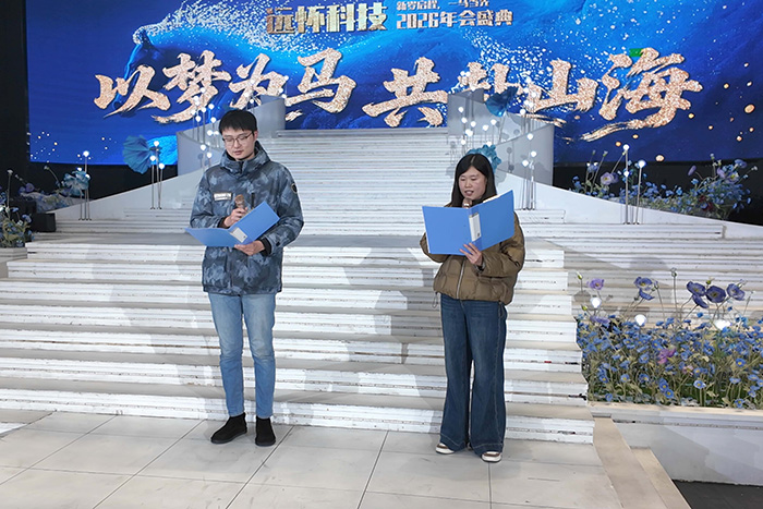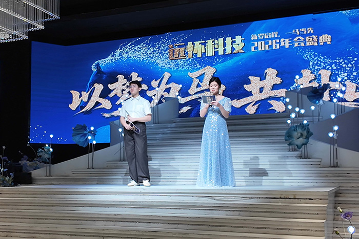 随着开场视频的播放,全场灯光暗下,主持人的开场提示瞬间点燃了现场氛围。在热烈的掌声中,主持人登场致开场词,同时回顾过去一年远怀在技术突破与市场拓展中的坚实足迹,也为全体伙伴送上了新年的祝福与展望。