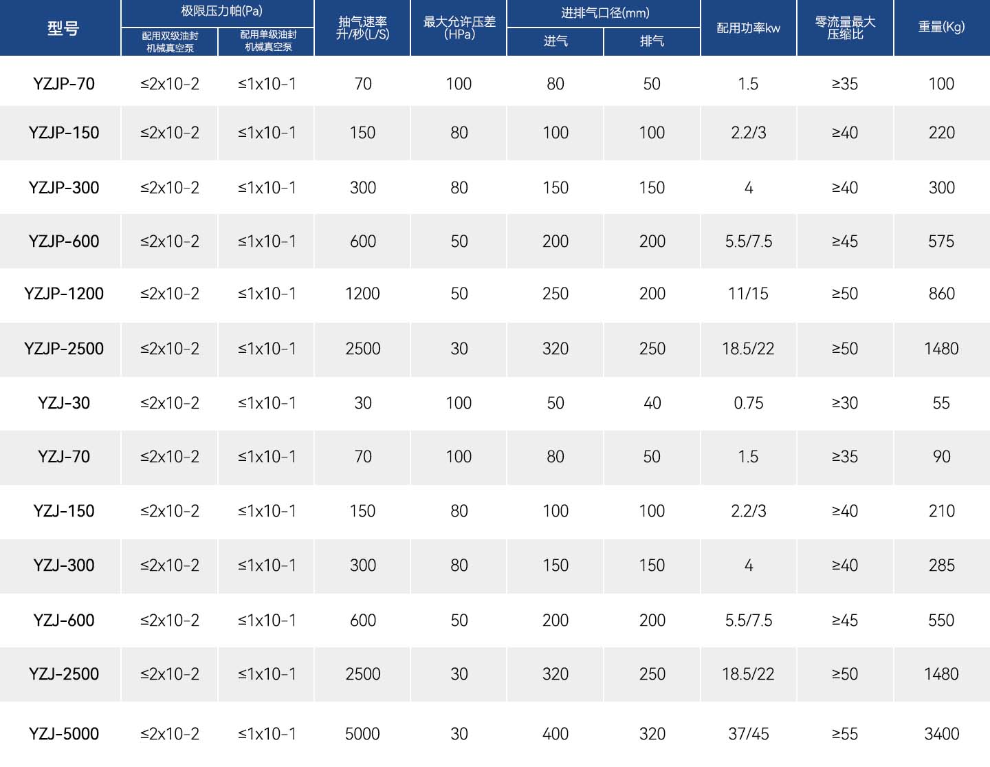 罗茨泵主要由一对同步高速旋转的“8”字形转子与两个半圆形的泵腔组成。该泵不能单独排气,必须与前级泵(如滑阀泵、旋片泵、水环泵、油环泵等)串联使用。在前级泵进气口前面串联上罗茨真空泵组成机组可提高前级泵的真空度,在有效范围内可大大提高抽气速率。罗茨真空泵的极限压力由前级泵决定,表中数据为标准配置(配用双级油封式机械真空泵)时的最低极限压力。罗茨泵广泛使用于真空浇铸、真空熔炼、真空脱气、真空镀膜行业及化工医药行业的真空蒸馏、真空干燥等。泵对小量灰尘不敏感。